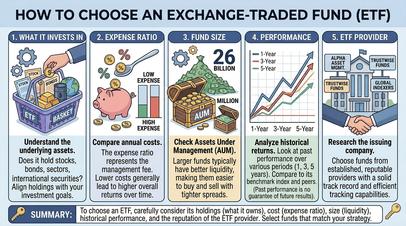 Choosing an ETF involves evaluating several key factors that affect diversification, cost, and reliability. Investors should first examine the ETF’s holdings, including how many assets it contains, its largest positions, and the types of risks those investments face. The expense ratio is also important, as lower fees help maximize long-term returns through compounding.