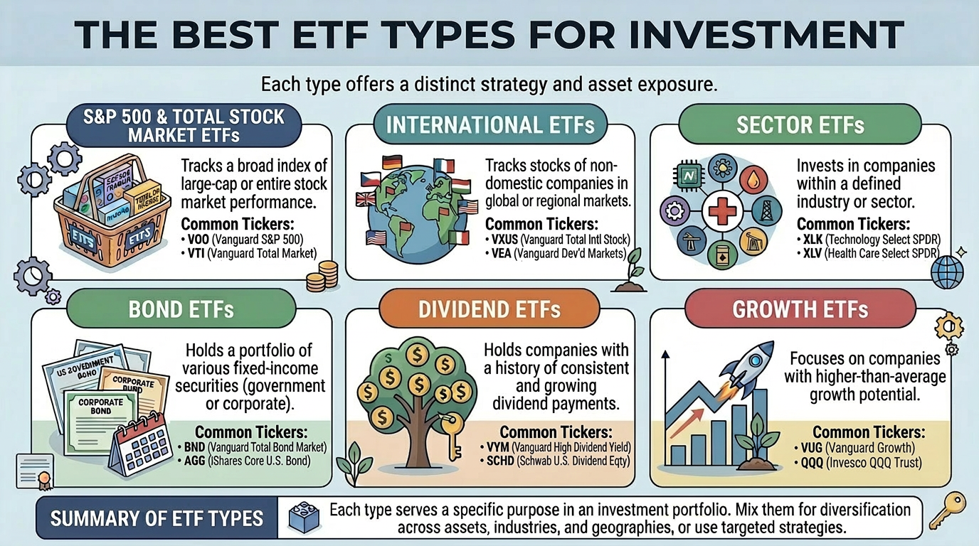 There isn’t a single “best” ETF for everyone because each investor has different goals, risk tolerance, and interests. This guide highlights some popular ETFs and explains what makes them useful, so you can see which ones might fit your investing style.